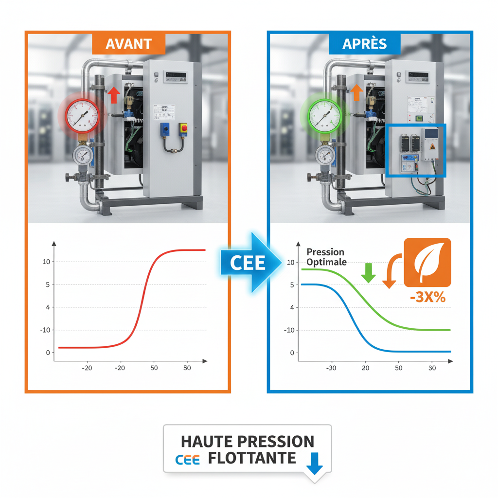 L’installation d’un système de régulation haute pression flottante est éligible au dispositif des Certificats d’Économies d’Énergie (CEE), permettant de bénéficier de primes énergie versées par les fournisseurs d’énergie.